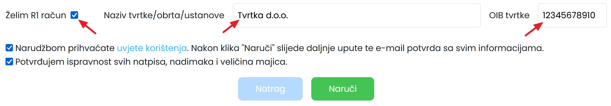 Ako ti treba R1 račun - na zadnjem koraku možeš zatražiti izdavanje R1 računa na tvrtku, obrt ili ustanovu. Odaberi kvačicu "Želim R1 račun" i upiši naziv tvrtke/obrta/ustanove i upiši OIB. Nakon uplate - poslat ćemo R1 račun odnosno e-račun. Javne ustanove kojima naručuju putem narudžbenice istu mogu poslati na naš e-mail info@megamajice.com